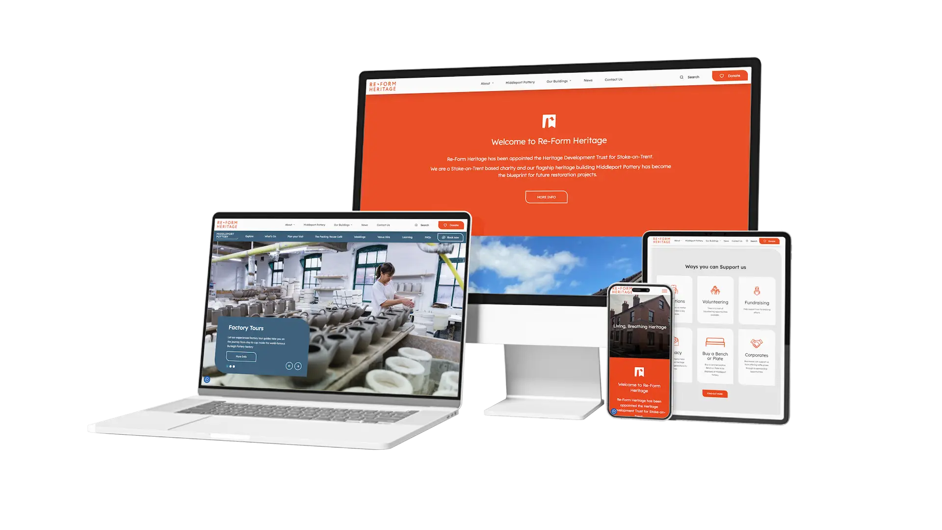 Re-Form Heritage, a local charity dedicated to restoring and transforming historic locations in and around Stoke-on-Trent, were looking for a brand new website to communicate not just who they are as a charity, but to showcase the portfolio of buildings they are restoring with a new lease of life.